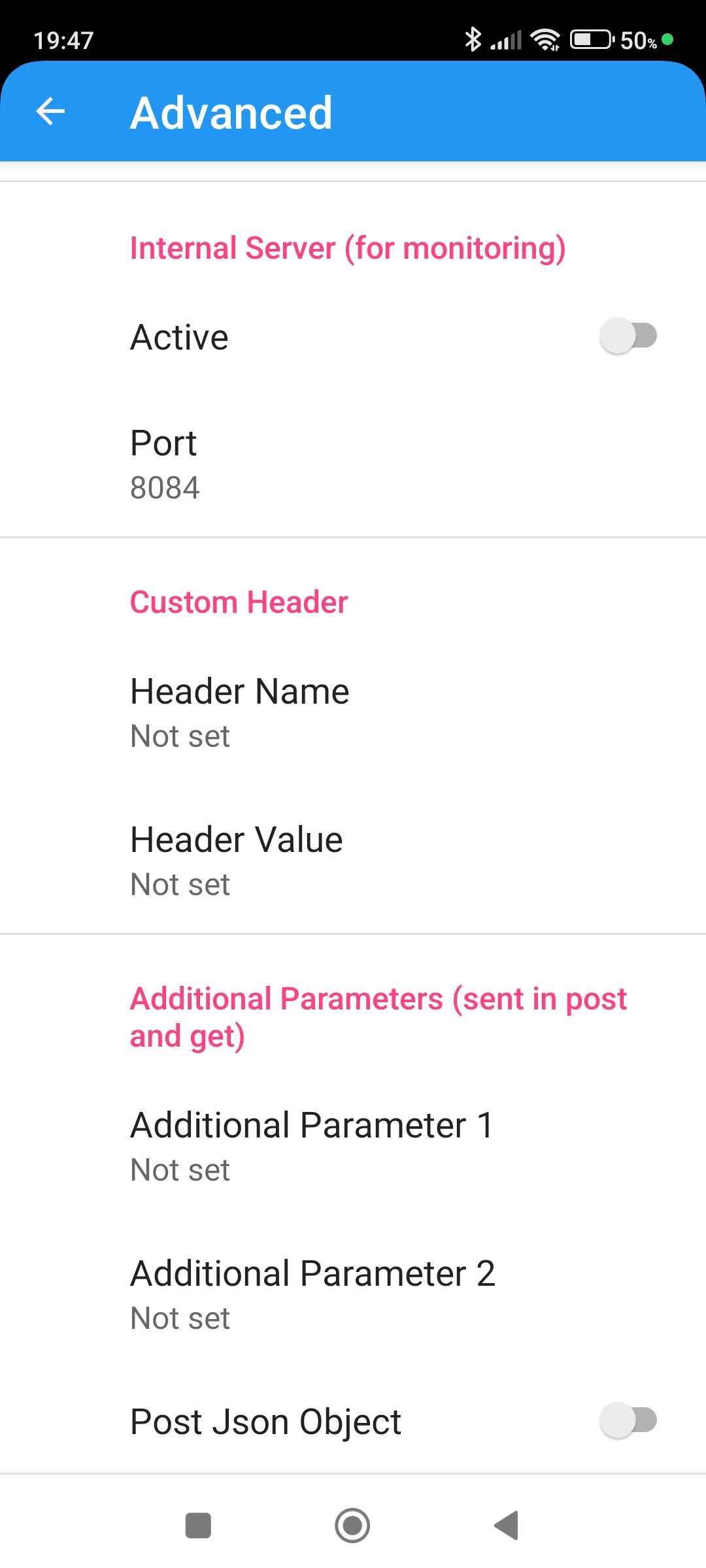 Parameters may be sent either as query parameters (for GET) or as form fields / JSON body (for POST). The app supports optional flag Post as JSON Object — when enabled, the POST payload will be a JSON object with the SMS fields and the additional parameters.